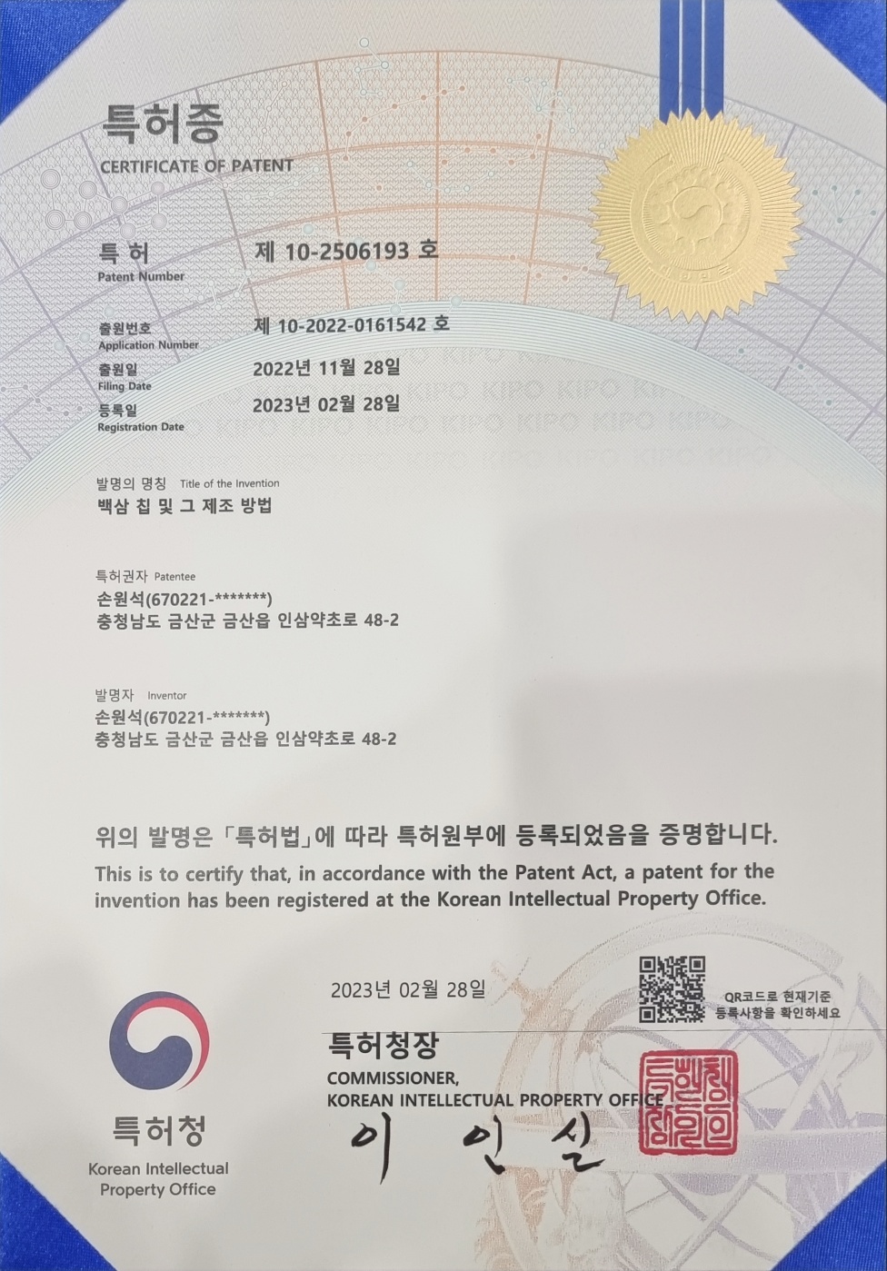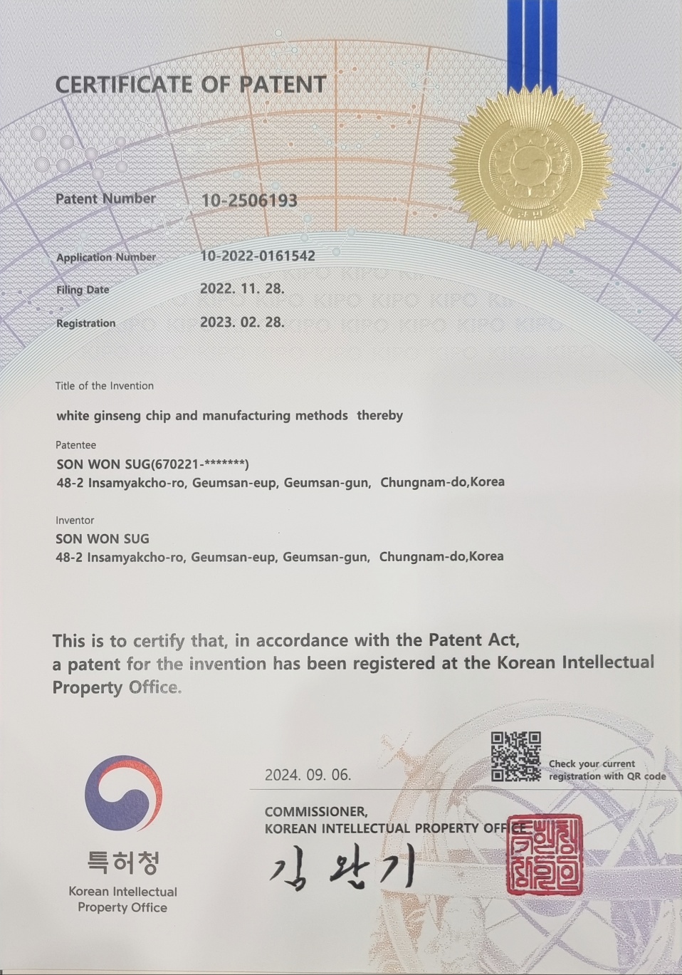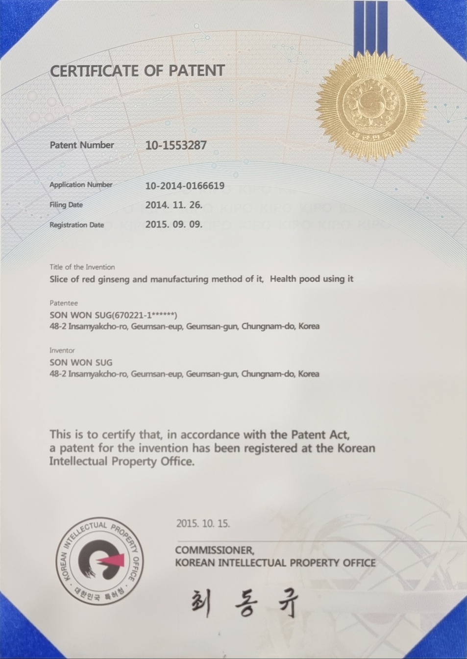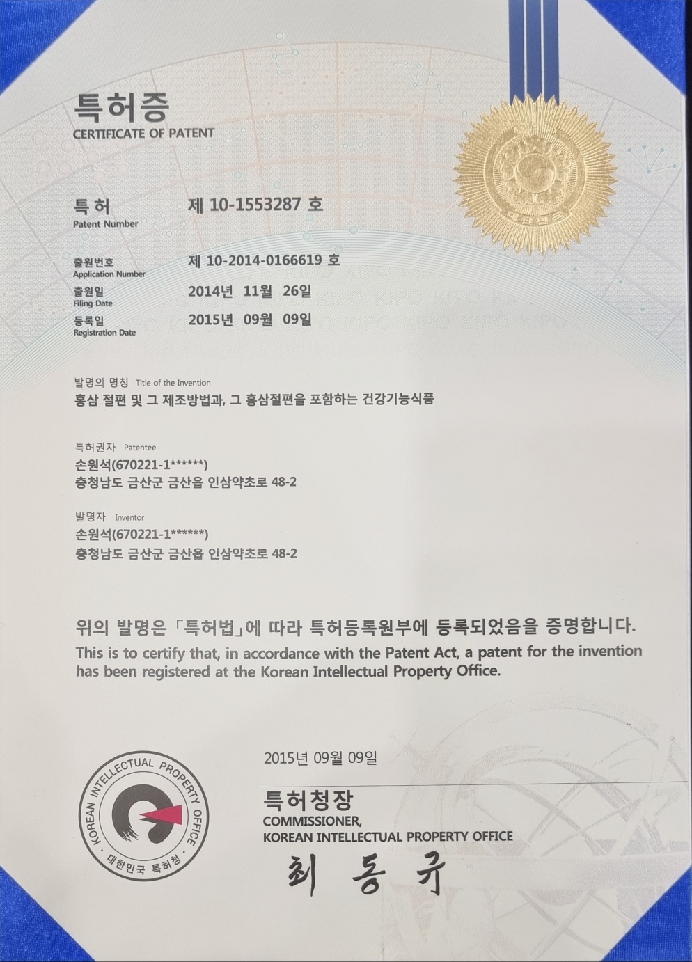 홍삼그대로 특허