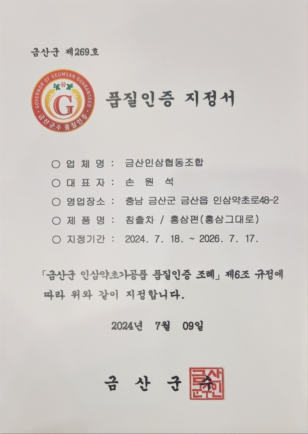 금산군수 품질인증