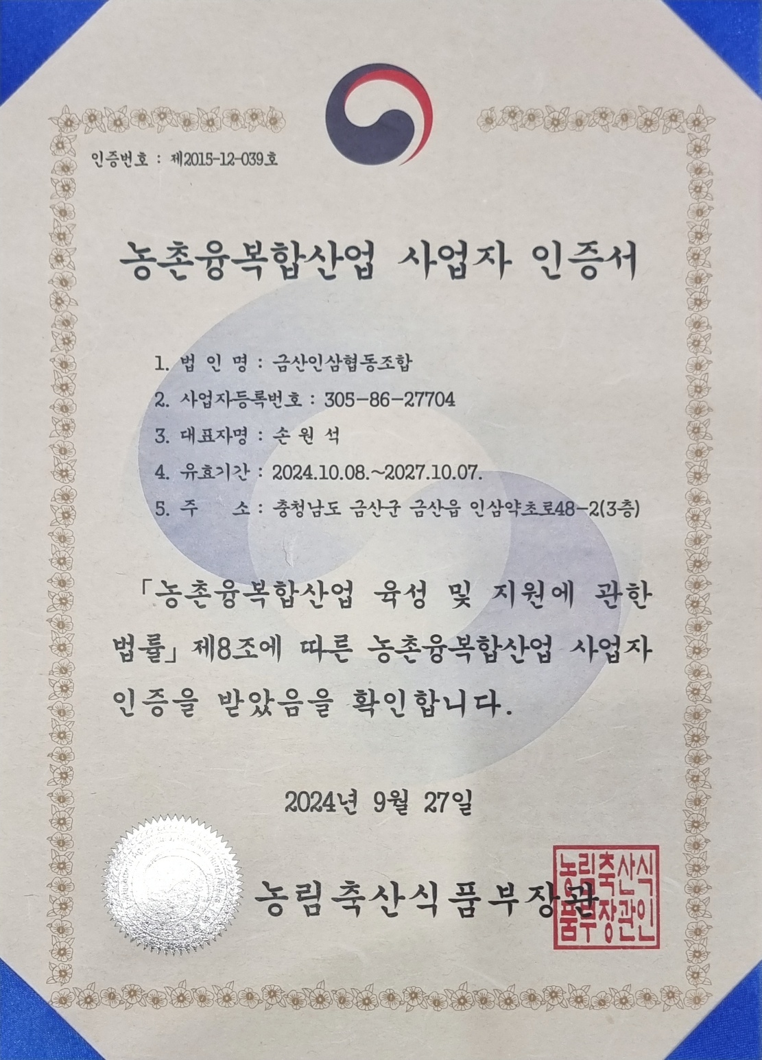 농촌융복합산업 사업자 인증서