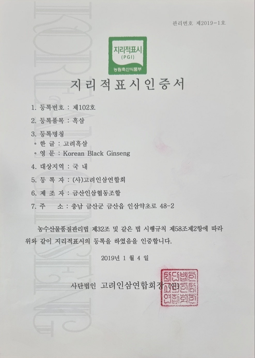지리적표시 인증서_고려흑삼