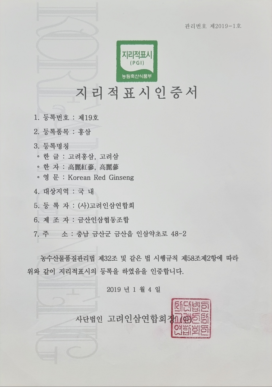 지리적표시인증서_고려홍삼,고려삼